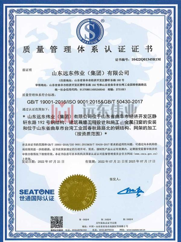 質(zhì)量管理體系認證證書 2023-09-13 09:26:35 上一條:環(huán)境管理體系認證證書 下一條: 企業(yè)信用等級證書 相關(guān)資訊 夯實基礎(chǔ)·砥礪奮進 | 重慶龍... 正在施工的和新承接的項目情... 近年完成的類似項目情況表... 關(guān)于加強項目部農(nóng)民工工資支... 熱門推薦 黃海明珠中心 濟寧運河城 開發(fā)區(qū)萬達廣場 中國重汽濟寧商用車有限公司